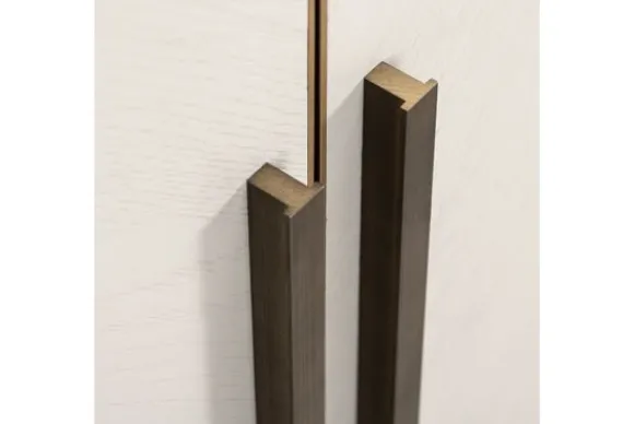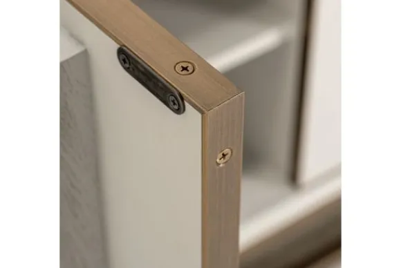 Dressoir Whitebone 211840 van het merk Richmond Interiors is een elegante, maar toch ook een stoer dressoir. Het dressoir is gemaakt van eiken fineer, waarvan de delen in een chique visgraatmotief zijn gelegd. Fineer is een dun laagje hout dat op plaatmateriaal wordt aangebracht. Dit wordt geproduceerd door een stam in dunne laagjes te snijden, hierdoor wordt de stam optimaal benut en is er weinig zaagverlies. Het strakke onderstel is gemaakt in de kleur Brass (staal in mat goud). Het dressoir is voorzien van vier deuren waar in totaal vier vakken achter zitten om al je spullen netjes op te kunnen bergen. In het midden bevinden zich drie open vakken om eventueel decoratie neer te zetten.