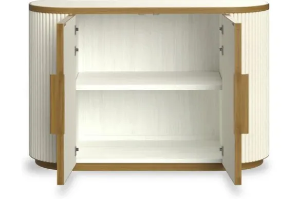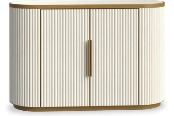 Het dressoir is uitgevoerd met een stevig frame en deuren met een subtiel reliëf. De goudkleurige handgrepen vormen een luxe detail en zorgen voor een mooi contrast.