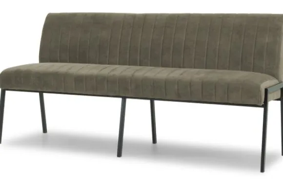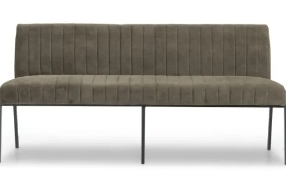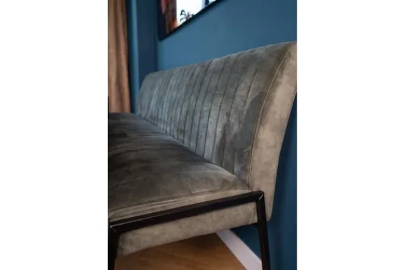 Deze eetbank wordt uitgevoerd met een metalen poot met kunststof dopjes en met verticale stiksels in de rugleuning.