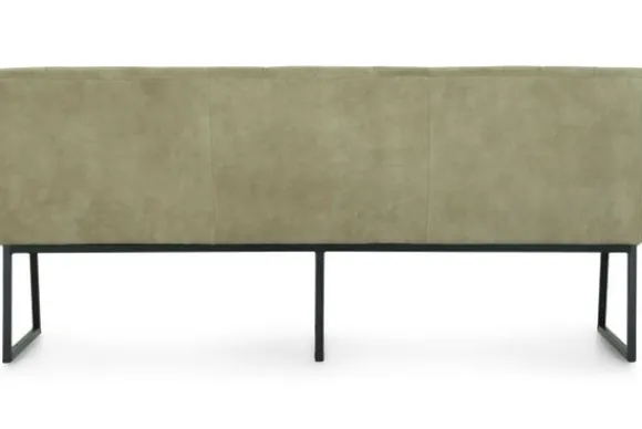 Deze eetbank is voorzien van zwart metalen poten en horizontale intrekkingen in de rugleuning. De Bullock is ook beschikbaar met andere stiksels in de rug. Deze eetbank heeft een simpel, elegant design. Twee handgrepen achter op de rugleuning zijn optioneel.