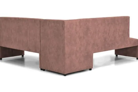 Deze hoekbank wordt standaard uitgevoerd met een open deel onder de zitting, met een gladde rugleuning en met glijdoppen.