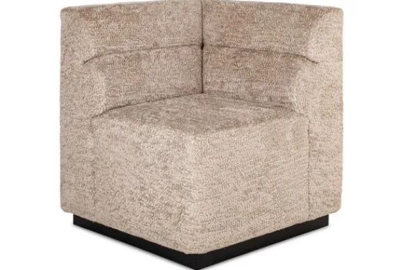 Hoekelement Delia 212760 van het merk Richmond Interiors is een zachte verschijning die meteen rust brengt aan de eethoek. Het lage zwarte voetstuk geeft de bank een stevige basis die mooi contrasteert met de zachte bekleding.