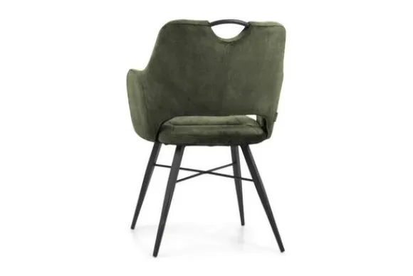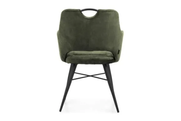 Eetkamerstoel Tirza groen van het merk Olijk is verkrijgbaar in de velvet stof Goldy: antraciet, hunter en cognac. Velvet is een stof die makkelijk te reinigen is en zeer slijtvast is. De stoel is uitgevoerd in de kleur groen en heeft een zwarte metalen poot. De armleuningen van de stoel lopen vloeiend over in de rugleuning, daarnaast heeft de stoel een handgreep die verwerkt is in de bovenkant van de stoel. De rugleuning is versiert met verticale stiksels.