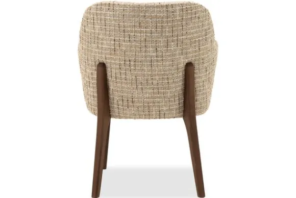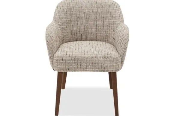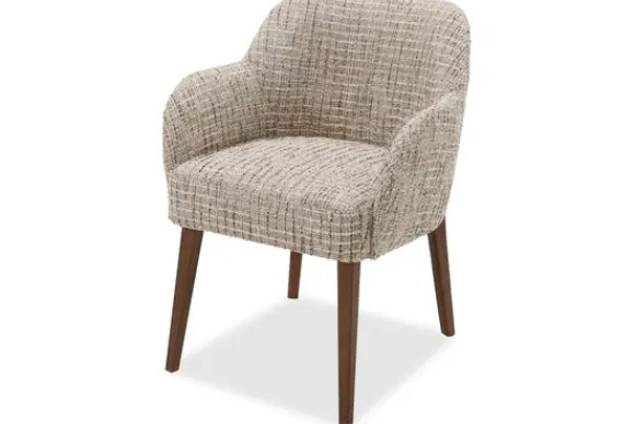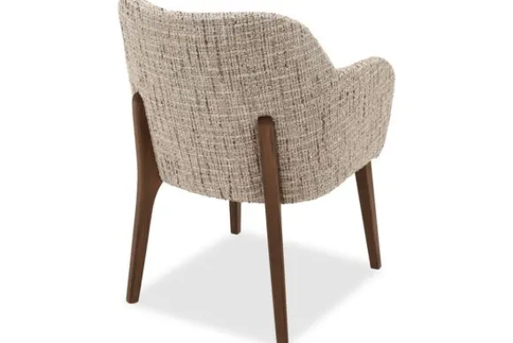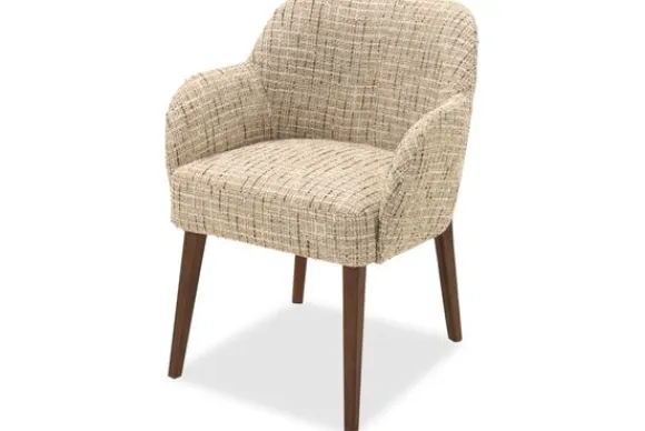 Eetstoel Rowena heeft een zachte, afgeronde vorm die uitnodigt om aan te schuiven. De armleuningen lopen vloeiend over in de rug en geven extra steun. Dankzij het compacte formaat past deze stoel gemakkelijk aan verschillende tafels.