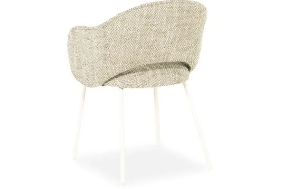 De subtiele opening tussen rug en zitting geeft de eetstoel een luchtig karakter. De zachte bekleding nodigt uit tot lang tafelen, terwijl de slanke metalen poten zorgen voor een stabiele basis.