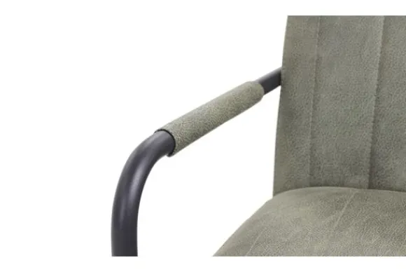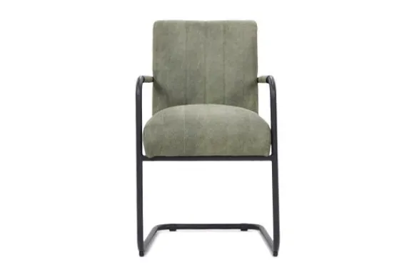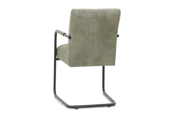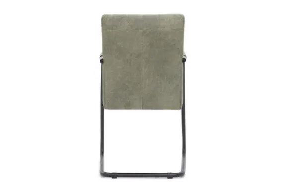 Deze eetkamerstoel wordt standaard uitgevoerd met een zwart metalen frame en met verticale stiksels in de rugleuning.
