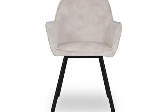 Eetkamerstoel Jolien van het merk Donc heeft zwart metalen poten en een rugleuning die rondom loopt en overgaat in armleuningen. De stoel oogt comfortabel en heeft een rustige moderne uitstraling.