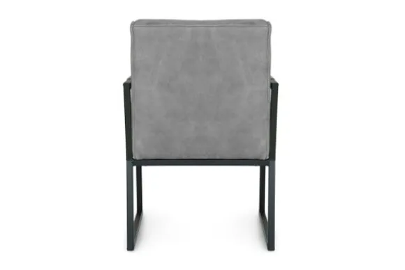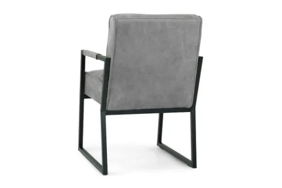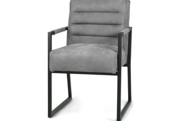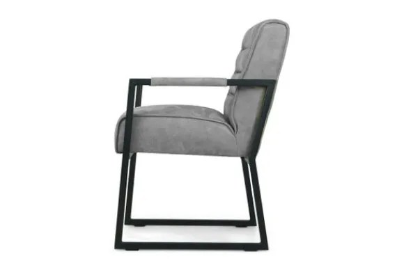 Eetkamerstoel Bullock van het merk Donc is beschikbaar in alle kleuren en in diverse materiaalsoorten zoals stof, kunstleder en rundleder. Deze eetkamerstoel is voorzien van zwart metalen poten, horizontale stiksels in de rugleuning en heeft metalen armleuningen. De armleuningen zijn voor een deel gestoffeerd, voor een comfortabel gevoel aan jouw armen. De Bullock is ook beschikbaar met andere stiksels in de rug en zonder armleuningen. Deze stoel heeft een simpel, elegant design. Een handgreep achter op de rugleuning is optioneel.