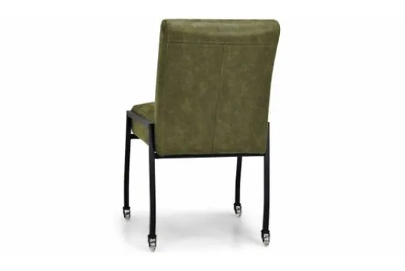 Deze eetkamerstoel wordt uitgevoerd met een ruitstiksel gestikt in een kader en met metalen poten met skatewieltjes.