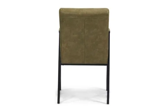Deze eetkamerstoel wordt standaard uitgevoerd met een zwart metalen frame en met horizontale stiksels in de rugleuning.