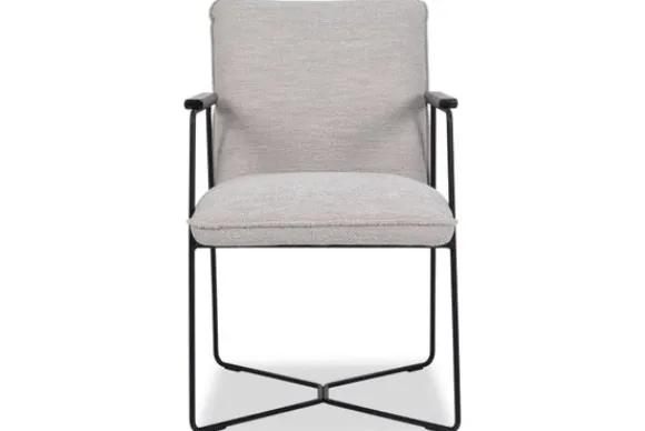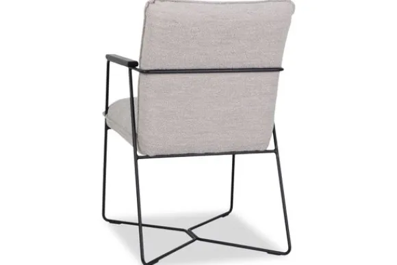 Eetkamerstoel Wouter van het merk Donc is een eetkamerstoel met armleuningen en houten armleggers. Het smalle metalen frame zorgt voor een open uitstraling aan de eettafel. De zitting en rug zijn afgewerkt met geknepen naden, wat zorgt voor een herkenbaar detail in het ontwerp.