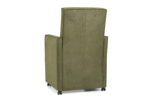 Deze stoel wordt standaard uitgevoerd met parketwieltjes, een gladde rug en zonder handgreep.