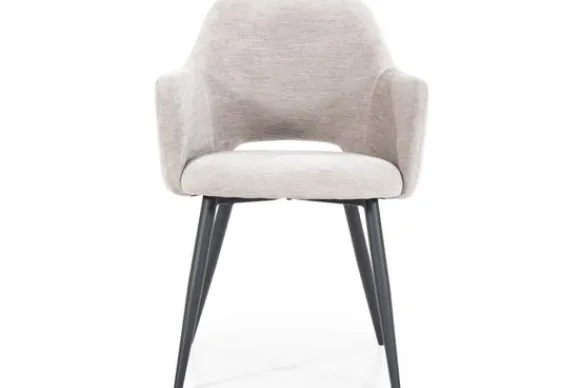 Eetkamerstoel Esmee Beige Mellow 95936 van het merk Eleonora is gemaakt van polyester. De fraaie uitsparing in de rugleuning geeft de stoel een luchtig en speels karakter. De zwarte, naar buiten staande poten zorgen ervoor dat de stoel lekker stabiel op de grond staat en draagt daarnaast bij aan de leuke speelse touch.
