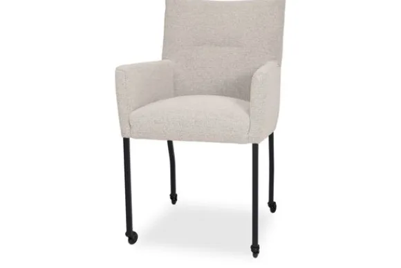 Eetkamerstoel Carina van het merk France in alle kleuren en in verschillende materiaalsoorten zoals stof, velvet en microvezel. De stoel biedt extra comfort vanwege de armleuningen. Het horizontale stiksel in de rug en de strakke vormgeving geeft de stoel een moderne uitstraling. De eetkamerstoel wordt geleverd met zwarte metalen poten met wieltjes.