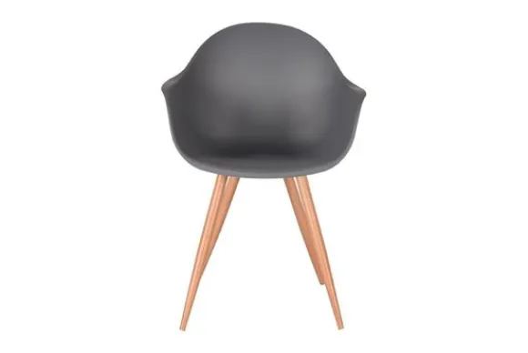 Eetkamerstoel Parma, uitgevoerd in antraciet polypropyleen heeft een zeer luxe en comfortabele kuip voorzien van elegante rondingen en armleuningen. Het materiaal is duurzaam en zeer gebruiksvriendelijk. Tevens is Parma in het bezit van licht uitlopende metalen poten voorzien van een cover met houtstructuur waardoor de stoel stevig op de grond staat en ook nog eens een frisse, speelse touch krijgt.