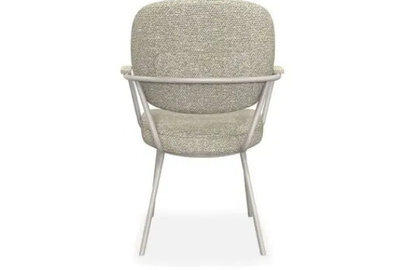 Het frame sluit mooi aan bij de stoffering en zorgt voor een rustige ton sur ton uitstraling. De combinatie van de naturel bouclé stof en de taupekleurige poten geeft de stoel een warm en evenwichtig geheel aan de eettafel.