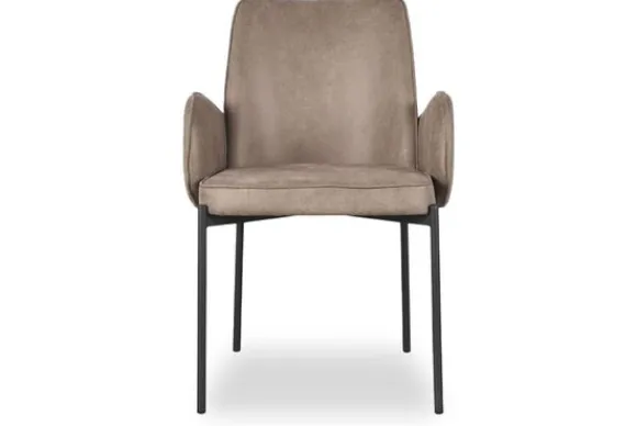 Eetkamerstoel Joni, uitgevoerd in taupe micro suède heeft een luxe ronde zitting, rugleuning en is in het bezit van armleuningen. Deze combinatie maakt Joni een luxe eetkamerstoel met ontzettend veel comfort. De armleuningen lopen achter de rugleuning langs waardoor de eetkamerstoel een uniek uiterlijk krijgt en er ook nog eens ontzettend leuk uitziet aan de achterkant. Dat is natuurlijk een fijne bijkomstigheid als de eetkamerstoelen aangeschoven staan aan tafel. Het ranke maar doorlopende zwarte frame waar de zitting als ware op rust geeft de eetkamerstoel een luchtige uitstraling. Het uiteinde van het frame loopt op vier zijdes een klein stukje door wat zorgt voor een speels effect.