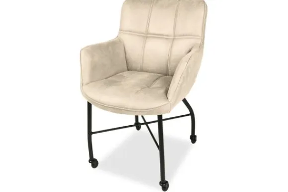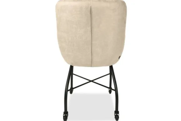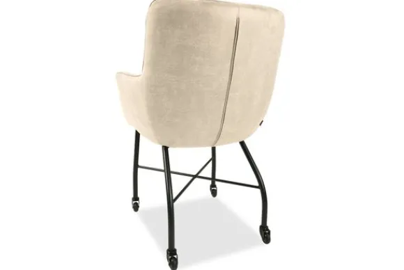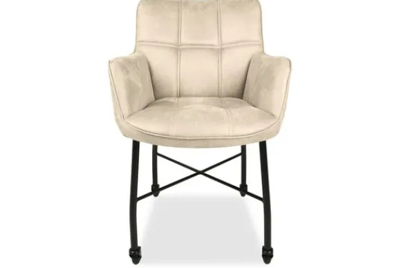 De eetstoel heeft verticale en horizontale stiksels in de rugleuning lopen, wat voor een mooi ontwerp zorgt. De stoel heeft armleuningen wat voor een comfortabele zit en goede ondersteuning zorgt. Deze eetkamerstoel heeft zwart metalen poten en wieltjes, waardoor de stoel gemakkelijk te schuiven is.