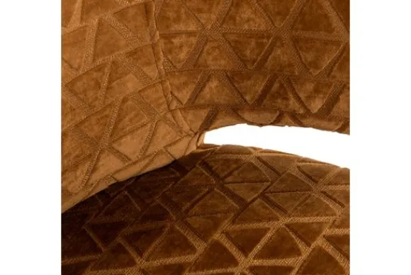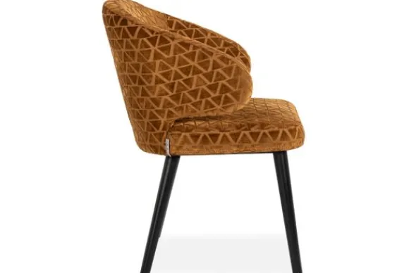 Eetkamerstoel Indigo 212795 Gold Triangle van het merk Richmond Interiors is een luxe stoel met zachte, bruine fluwelen bekleding met een geometrisch patroon. De afgeronde rugleuning en zwarte houten poten geven het design een moderne, verfijnde uitstraling. Perfect voor een eclectisch of bohemian interieur.