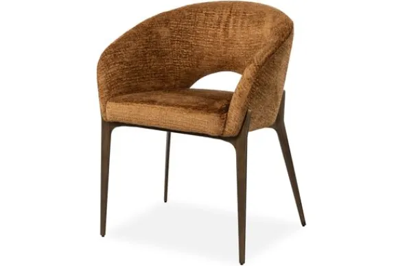 Eetkamerstoel Kenzi 212901 van het merk Richmond Interiors is gestoffeerd met Fusion Cognac 28. Fusion is een stevige kwaliteitsstof met een licht 3D-effect. De stof heeft een voluminieuze, luxe uitstraling en voelt zacht aan. De poten zijn gemaakt van brass (staal in mat goud) en lopen voor een gedeelte over de rugleuning en zijkanten van de eetstoel.