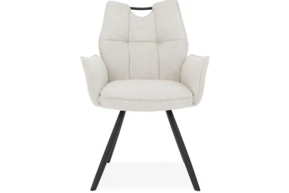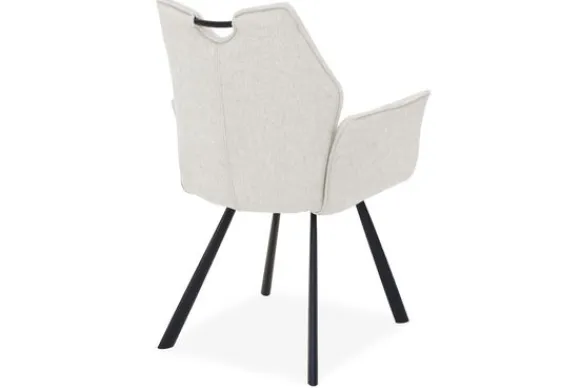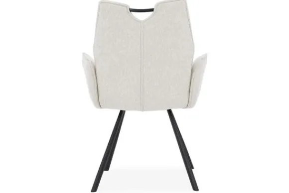 Het subtiele stiksel in de rugleuning geeft de stoel een speels detail, terwijl de zwarte metalen poten zorgen voor een stabiele basis. Het stijlvolle contrast tussen het lichte textiel en de donkere poten maakt deze eetstoel passend in diverse interieurs.