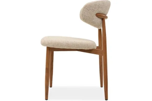 Eetkamerstoel Kumo biedt dankzij de zachte bekleding en afgeronde rugleuning een comfortabele zit, ideaal voor lange avonden aan tafel.