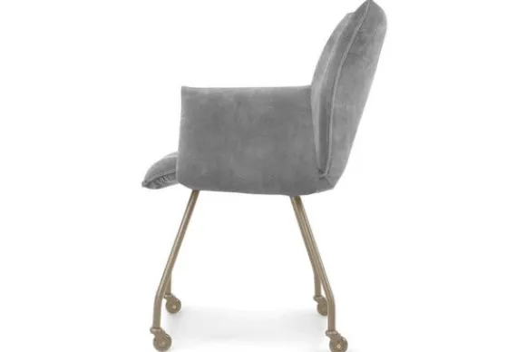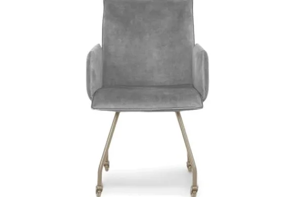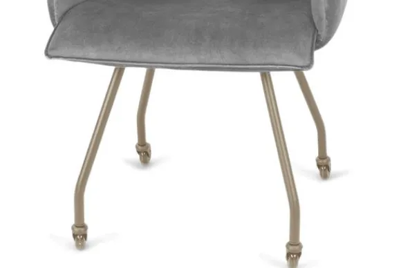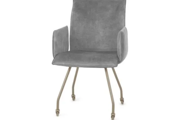 Eetkamerstoel Jussie van het merk Titan Design is beschikbaar in alle kleuren en in verschillende materiaalsoorten zoals stof, velvet en rundleder. De Jussie stoel is beschikbaar in diverse uitvoeringen. Deze Jussie is voorzien van armleuningen en beige metalen poten met wieltjes. Je kunt er ook voor kiezen om de Jussie uit te voeren zonder wieltjes. Deze stoel heeft een unieke uitstraling dankzij de opening tussen de arm- en rugleuning.