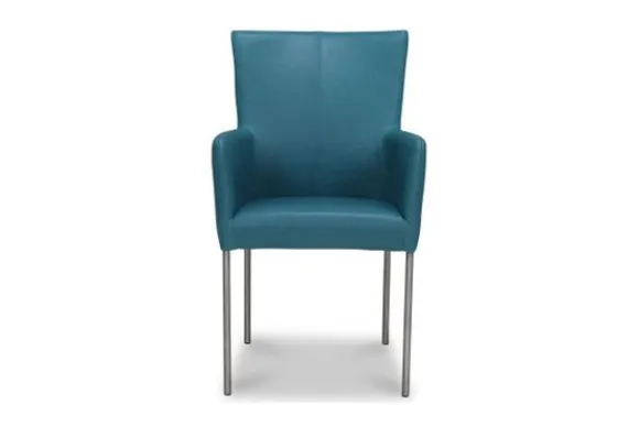 Deze stoel wordt standaard uitgevoerd met RVS poten zonder wieltjes.