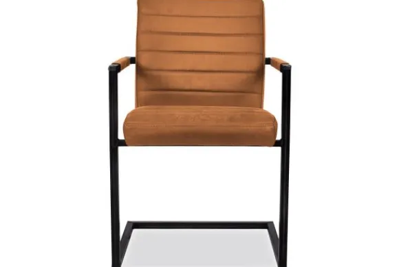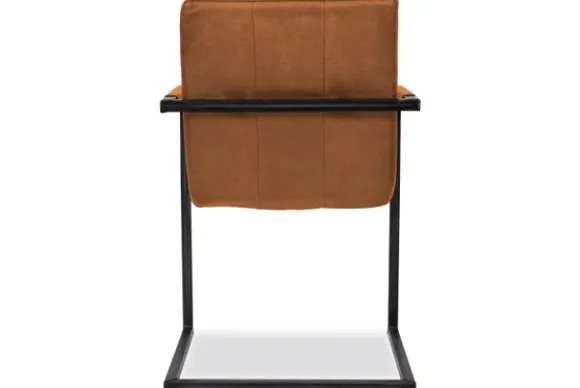 Eetkamerstoel Rocca NI 0123 cognac van het merk Tower Living is beschikbaar in vier kleuren: antraciet, bruin, cognac en groen. Deze stoel is bekleed met de Bull 28 (cognac) en heeft geborsteld stalen poten. De poten lopen door tot armleuningen die voor een deel bekleed zijn. In de zitting en in de rugleuning vind je horizontale stiksels.