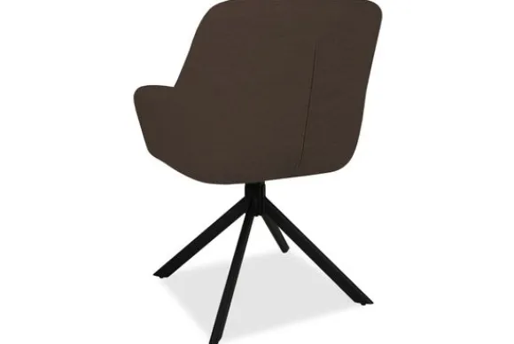 Deze eetkamerstoel heeft een zwart metalen spinpoot, daarnaast is de stoel voorzien van armleuningen en stiksels in de rugleuning.