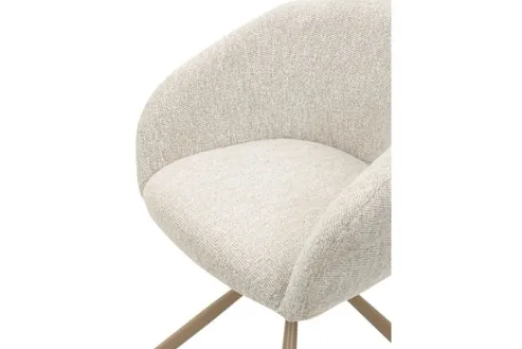 Eetstoel Pleko van het merk Divani is een moderne draaistoel die comfort en functionaliteit stijlvol samenbrengt. De zitting heeft een ronde, uitnodigende vorm met een zachte rug en geïntegreerde armleuningen die zorgen voor een geborgen en comfortabele zit. De stoel is uitgevoerd in de stof Lodge Linen 110.