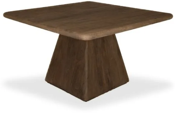 Eettafel Asti van het merk Tower Living combineert een krachtig silhouet met de warme uitstraling van natuurlijk mangohout in een diepe bruine tint. Het royale vierkante blad met afgeronde hoeken rust op een brede, taps toelopende voet, wat zorgt voor een uitgebalanceerde en robuuste vorm die toch elegant oogt. De zichtbare houtstructuur benadrukt het ambachtelijke karakter en voegt een rijke textuur toe.