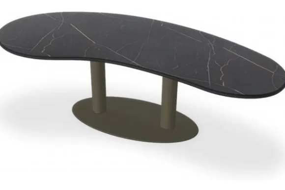Eettafel Nuvio van het merk Every Table BV heeft een organisch gevormd HPL blad van 2,8 centimeter dik. Het blad is verkrijgbaar in verschillende maten en wordt standaard geleverd met een ronde rand.