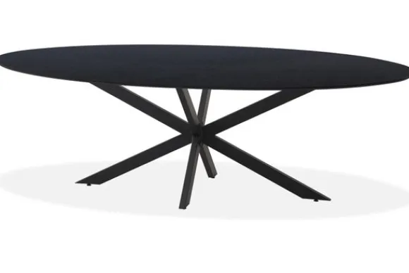 Eettafel Sevron van het merk Ideco brengt een krachtig samenspel van luxe en stoer design. Het ovale blad in de kleur Black Cement heeft een verfijnde, steenachtige structuur die een robuuste en eigentijdse uitstraling geeft. De subtiel afgeronde randen en taps toelopende afwerking zorgen voor een zachte, elegante touch, waardoor deze tafel perfect aansluit bij zowel een modern industrieel interieur als een chique urban setting.