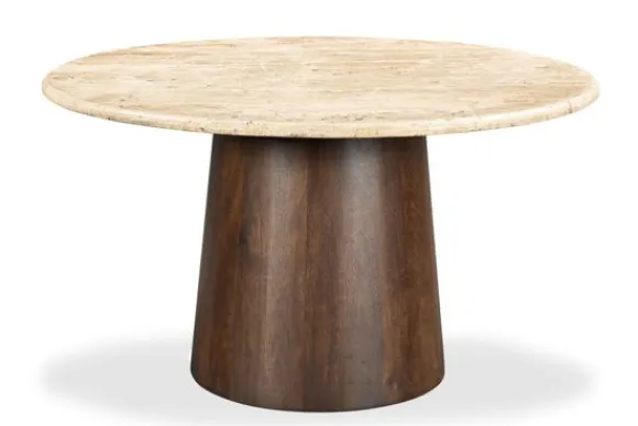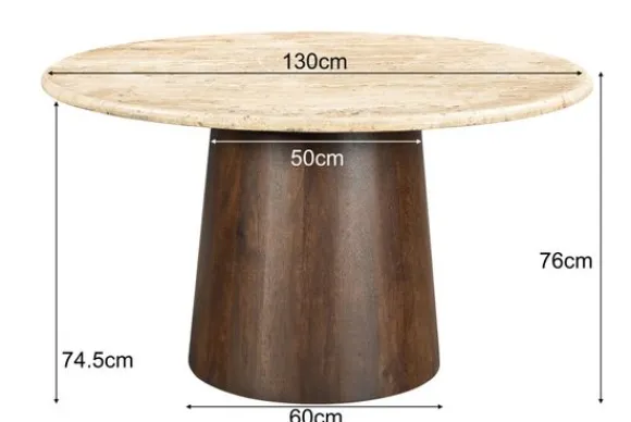 Eettafel Valentino van het merk Livingfurn is een prachtige combinatie van natuurlijke materialen en een warm design. Het blad, gemaakt van travertin, heeft een zachte beige tint met een subtiel patroon dat meteen een luxe uitstraling geeft. De stevige kolompoot van mangohout voegt daar een warme, natuurlijke touch aan toe en maakt de tafel een echte blikvanger.