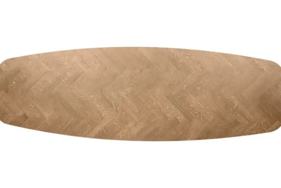 Het tafelblad is gemaakt van massief eikenhout, een houtsoort die bekendstaat om zijn levendige uitstraling. In deze uitvoering is het blad afgewerkt met een visgraat motief dat direct sfeer en structuur toevoegt aan de ruimte. Dankzij de noesten en nerven is elk blad uniek. Het blad is zes centimeter dik en straalt kracht en kwaliteit uit. Liever een andere afwerking? Je kunt ook kiezen voor een glad blad of een roman motief.