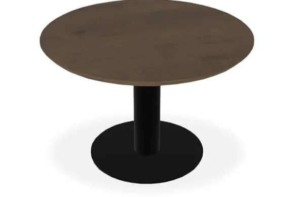 Het stevige onderstel met ronde middenpoot en metalen voet zorgt voor stabiliteit en een strak geheel. Deze combinatie van hout en metaal maakt Bodari perfect voor een industrieel interieur, waar stoere materialen en eenvoud samenkomen. Tegelijk past het ronde blad en het ontwerp goed in een modern interieur, waar strakke lijnen en functionaliteit de ruimte bepalen.
