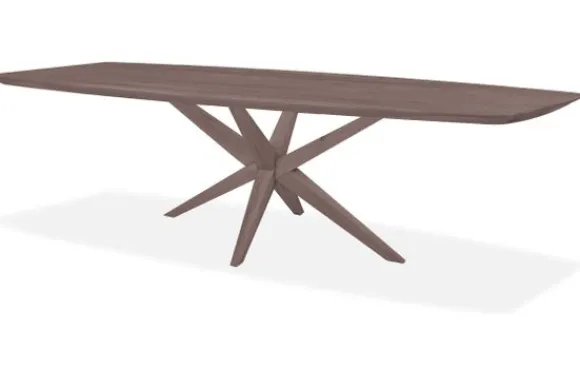Eettafel Mingo van het merk De Houtmaatschappij combineert natuurlijke elegantie met een speels en verfijnd design. Het tonvormige blad, uitgevoerd in warmbruin hout, straalt een tijdloze charme uit en brengt warmte in iedere eetruimte. Het blad is 4 cm dik, waarvan 2 cm opgedikt – een detail dat bijdraagt aan de massieve en luxueuze uitstraling van het geheel. De unieke stervormige poten voegen een dynamisch element toe en geven de tafel een luchtige, moderne uitstraling.
