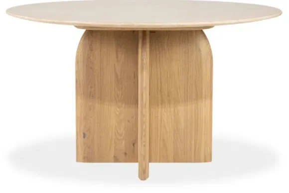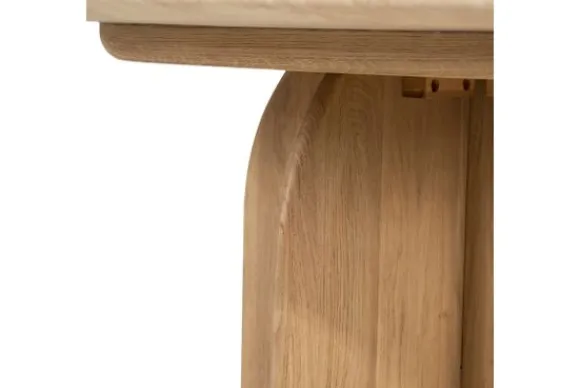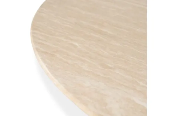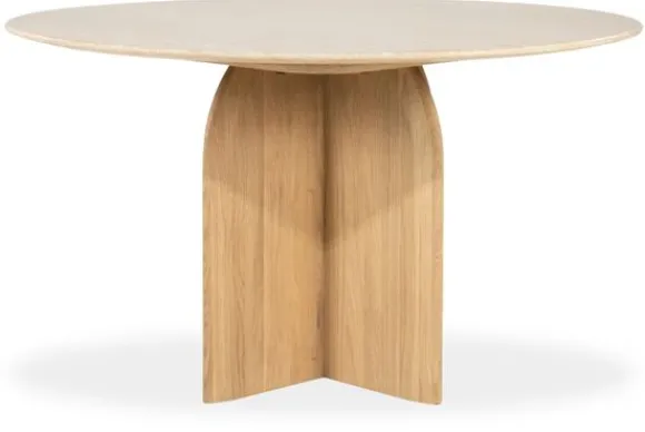 Eettafel Lova 96598 van het merk Eleonora is uitgevoerd met een rond blad van travertin en een onderstel van eikenhout. Het blad heeft een lichte kleur met een zichtbare steenstructuur. De ronde vorm zorgt voor een gelijkmatige verdeling van de ruimte rondom de tafel. Het onderstel bestaat uit meerdere eiken delen die elkaar kruisen in het midden. Dit zorgt voor een stevige en stabiele constructie.