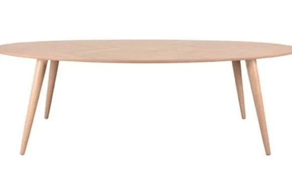 Eettafel Ines heeft een ovaal tafelblad dat rust op vier kegelvormige hoge poten. Doordat de poten licht naar binnen staan krijgt de tafel een speels accent. Het vissengraatpatroon op het tafelblad geeft de tafel een elegante uitstraling. Deze tafel past perfect in een modern en minimalistisch interieur.