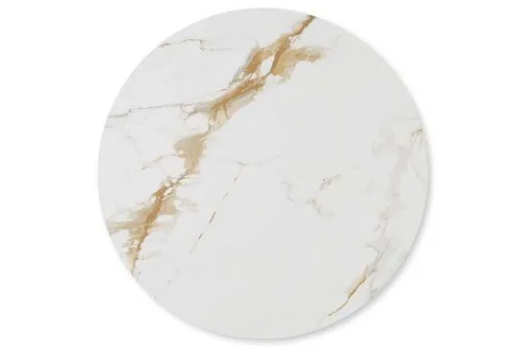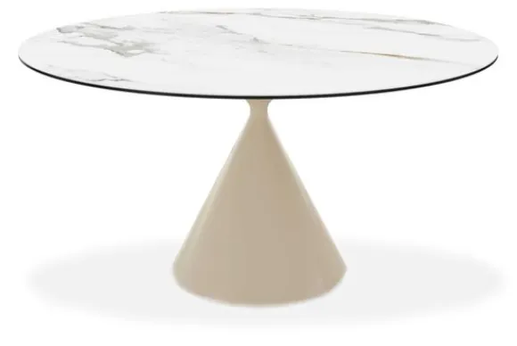 Eettafel Sonata van het merk Leska is een moderne blikvanger met een luxe uitstraling. Het ronde tafelblad is uitgevoerd in wit marmerlook met subtiele grijze en goudkleurige aders, wat zorgt voor een stijlvol en elegant karakter. De combinatie van het slanke blad en de kegelvormige poot in een warme beige tint geeft de tafel een eigentijdse en verfijnde uitstraling.