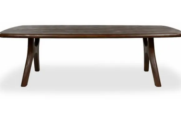 Eettafel Addo van het merk MySons is een rechthoekige eettafel met afgeronde hoeken en twee stevige pootconstructies aan de uiteinden. Het lange blad heeft een donkerbruine afwerking waarbij de houtstructuur duidelijk zichtbaar is. De plaatsing van de poten zorgt voor veel beenruimte en biedt plaats aan meerdere stoelen langs de lange zijdes. Deze tafel past goed in een Japandi interieur en een landelijke woonstijl.