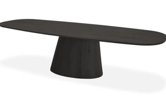 Eettafel Hedera van het merk Premium Interior is een stomp ovale tafel met een houten blad en een brede houten middenpoot.