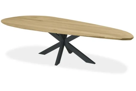 Eettafel Hedera van het merk Premium Interior heeft een kiezelvormig blad en staat op een centraal onderstel. De vorm van het blad en de plaatsing van de poten zorgen voor een stabiele tafel die praktisch is in gebruik.