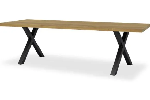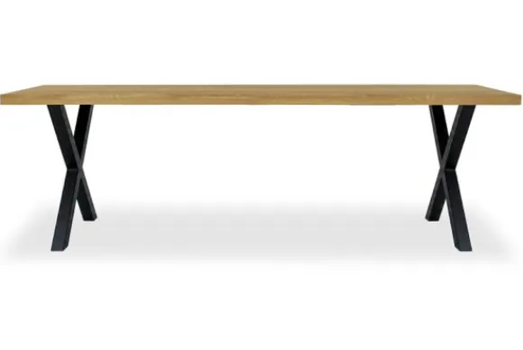 Eettafel Acel van het merk van Dijk Furniture is in verschillende afmetingen leverbaar en gemaakt van 100% massief Europees eikenhout. Eikenhout zorgt voor karakter en een unieke look. Het tafelblad is 4,7 cm dik waarvan 2,4 cm opgedikt en heeft aan de zijkanten een strakke afwerking. Elk blad is uniek! Verder heeft deze eettafel metalen X poten. Het voordeel van een tafel met vier poten in de hoeken is dat je langs alle kanten van de tafel stoelen kunt plaatsen. Je kunt kiezen uit verschillende pootmogelijkheden. Maatwerk is mogelijk op aanvraag!