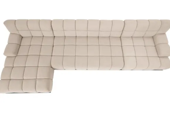 Bankstel Trentino van het merk Moderno is een bank met geblokte zit- en rugkussens en een zitting die doorloopt tot net boven de grond.