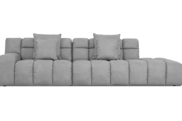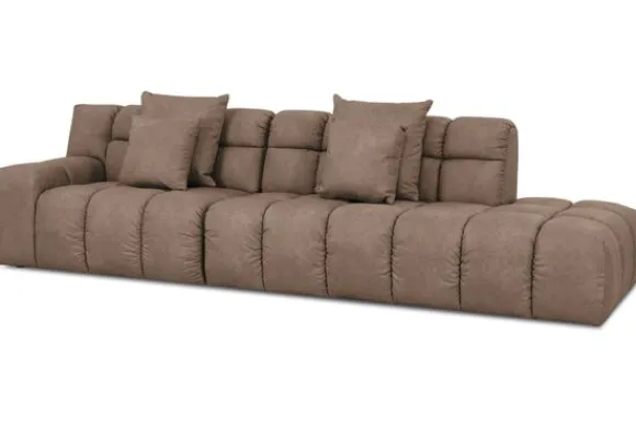 Bankstel Trentino van het merk Moderno is een bank met geblokte zit- en rugkussens en een zitting die doorloopt tot net boven de grond.