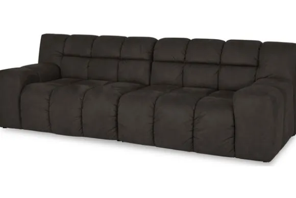 Bankstel Trentino van het merk Moderno is een bank met geblokte zit- en rugkussens en een zitting die doorloopt tot net boven de grond.
