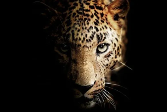 Glasschilderij Panterkop 080120-456 van het merk Ter Halle toont de kop van een panter. De gefocuste blik en donkere omgeving geven contrast en passen goed in een moderne of hotel chic interieurs.