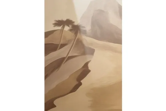 Glasschilderij Rocky Palm van het merk Urban Cotton toont een sereen woestijnlandschap met zachtglooiende duinen, ruige rotsformaties en twee elegante palmbomen die afsteken tegen het licht. De warme aardetinten en zachte penseelstreken creëren een tijdloos tafereel dat uitnodigt tot rust en contemplatie.